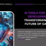 AI tools for game development infographic showing a smartphone with glowing futuristic icons and tech elements, highlighting how AI is transforming modern gaming.